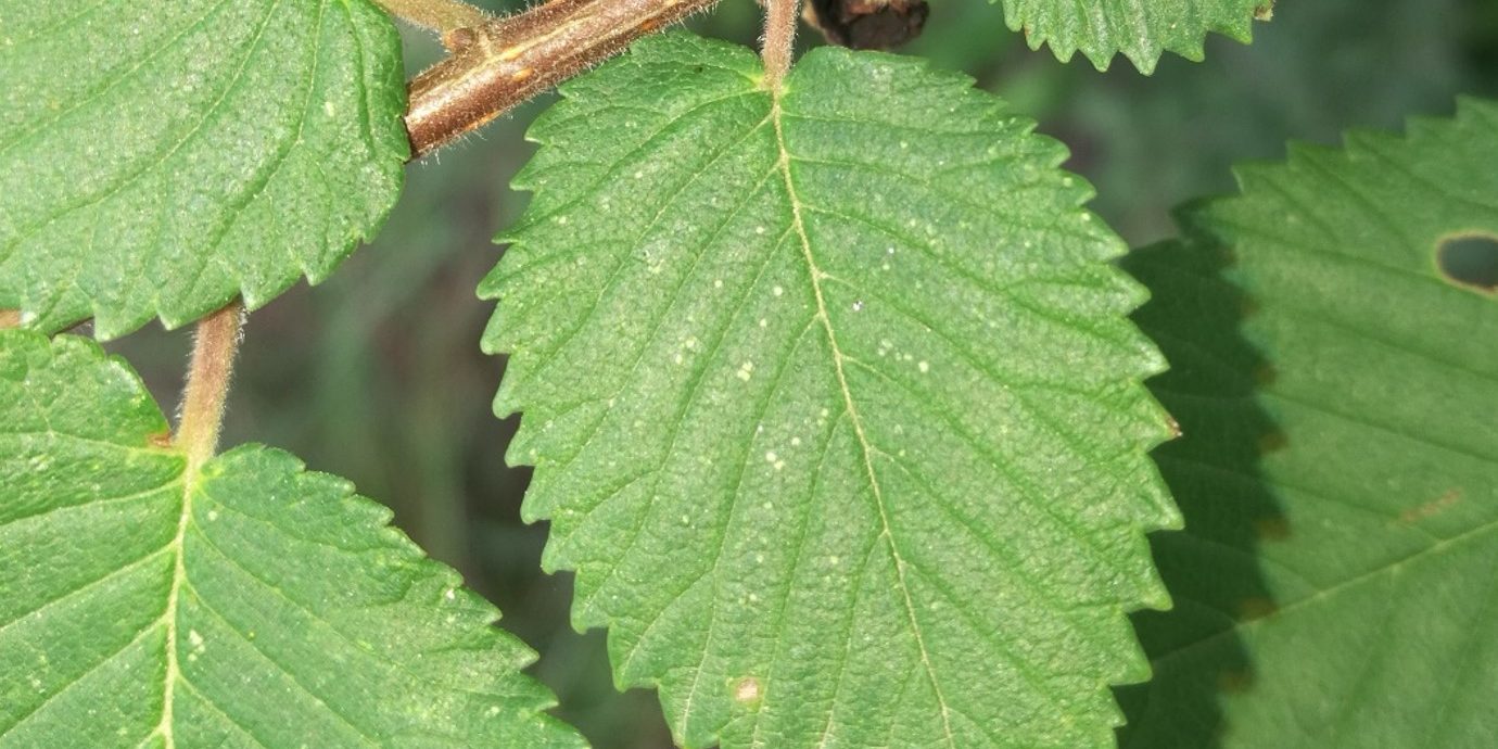 Τα φύλλα είναι κατ’εναλλαγή, 4,5-9 εκ., μίσχος έως και 1,5 εκ., έλασμα ωοειδές έως σχεδόν κυκλικό, βάση ασύμμετρη που δεν καλύπτει τον μίσχο, επάνω επιφάνεια γυμνή ενώ η κάτω συνήθως χνουδωτή (κυρίως στις γωνίες των νεύρων) και με παρυφές διπλά πριονωτές.